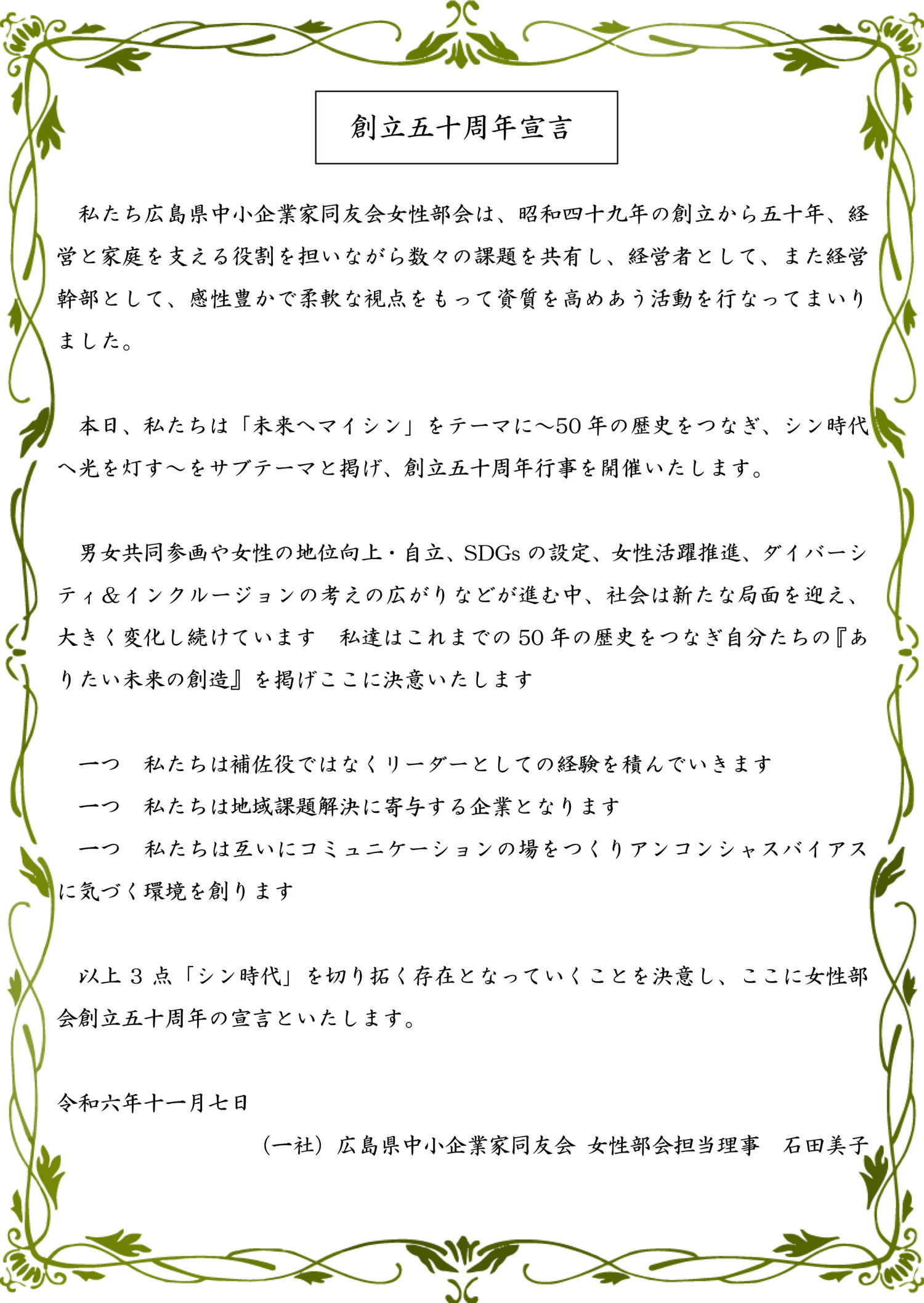以上3点「シン時代」を切り拓く存在となっていくことを決意し、ここに女性部会創立五十周年の宣言といたします。