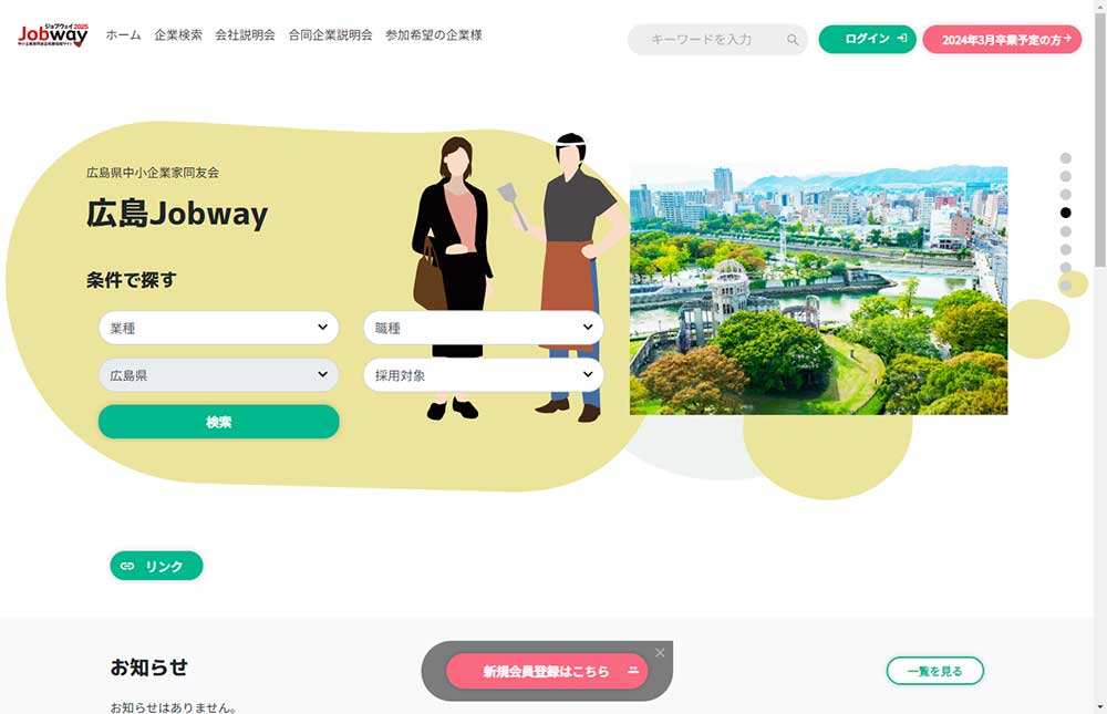 県内のエリア(広島市、廿日市市、大竹市、東広島市、福山市、府中市、尾道市、三原市、呉市)の企業を48社掲載。希望職種からも見れるようになっています。