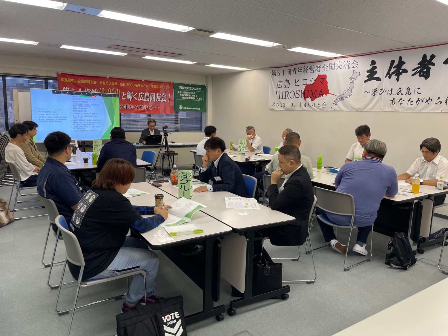 軽妙な語り口と冗談を交えながらこれまでの歩みを語っていただきました。経営指針を奥さんに見せた時に「あんた、そんな事考えていたん?」といつも隣りで一緒に働いている奥さんでさえ社長の考えている事がわからない現実。改めて経営指針を発表し社員と共有する大切さを教えていただきました。今回の例会がきっかけで一緒に働いている息子さんと継承の話が出来た、と照れながら嬉しそうに話されている姿が印象的でした。