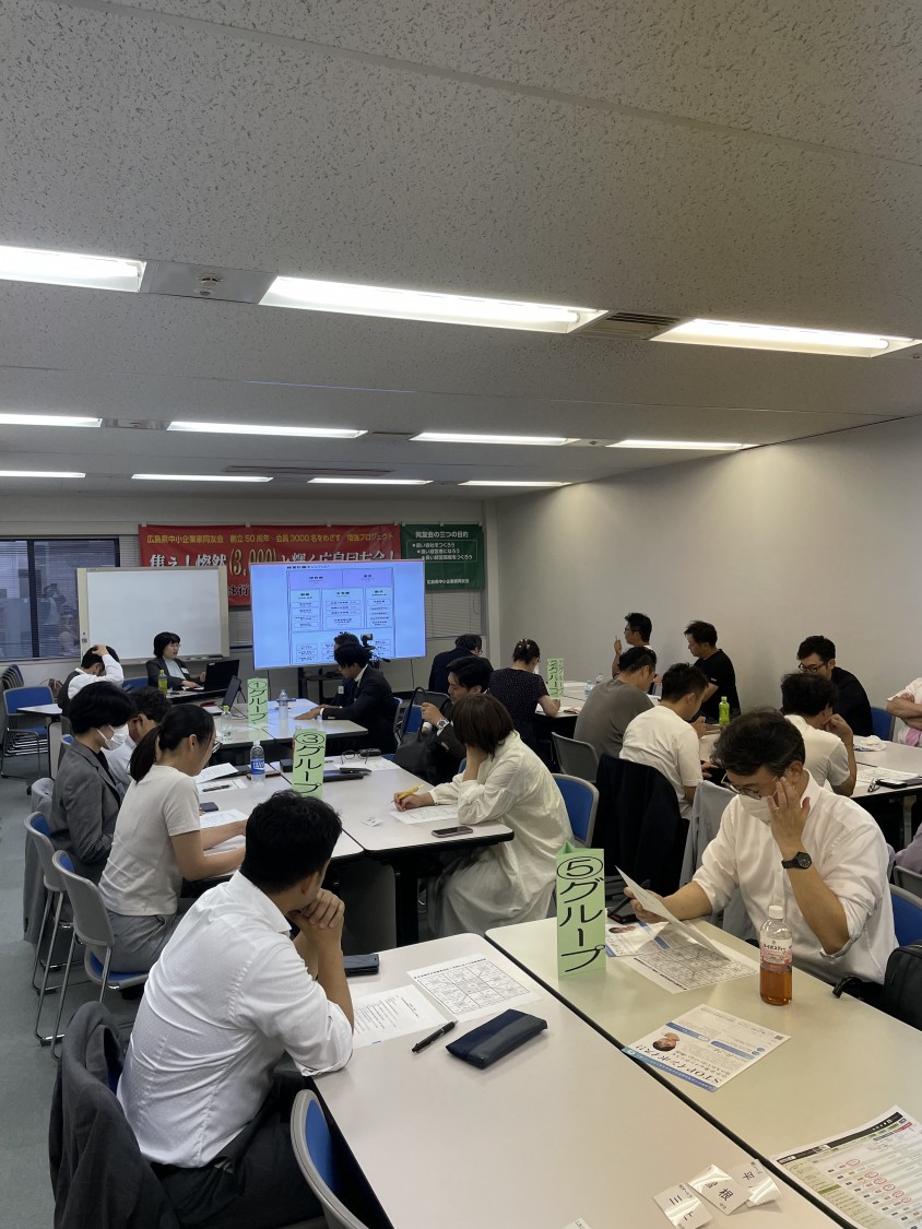 7月例会は全体参加者が44名と多く、他地区会の参加者も多い例会となりました。前半は自社を高収益化するための策を高塚氏にご講演をいただき、後半のグループ討論では、自分の夢を実現するためのマンダラチャートを作る時間を設け、埋まらない所を各グループ内で提案を出し合いながら和気あいあいとディスカッションをする事が出来た例会となりました。