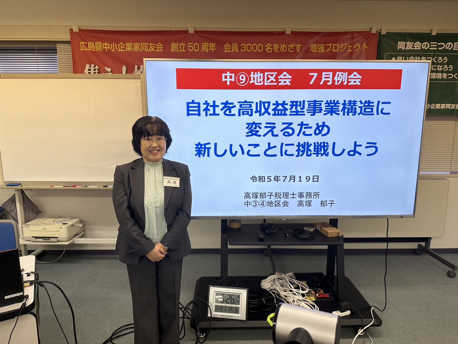 中⑨地区会の7月例会は、中③④地区会の経営計画コンサルタント・税理士の高塚郁子氏をお招きし、【自社を高収益型事業構造に変えるために新しい事に挑戦しよう】をテーマに例会を開催しました。