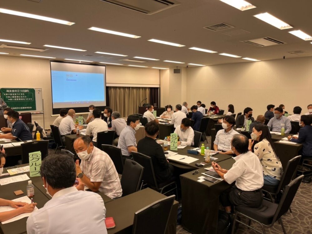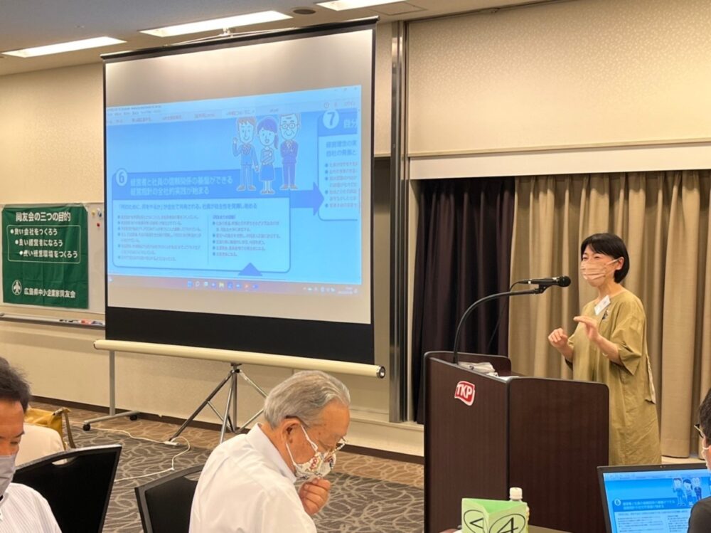 まず最初に、道垣内 県組織委員長からの「広島同友会50周年3,000名会員について」という内容で研修がスタートしました。1973年10月からスタートした広島同友会の会員数の推移の説明を受ける中で、増強に力を入れる趣旨・想いを感じることができました。