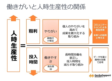 働きがいと人時生産性を一緒に考えてみます。人時生産性をあげるには、投入時間を減らすか、粗利を増やすしかありません。