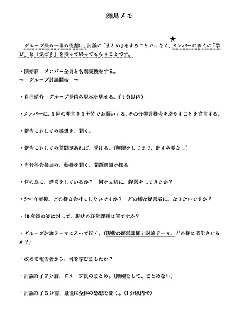 瀬島氏にはグループ長研修と、氏自らがグループ長を務めて討論の様子を公開して学びました。