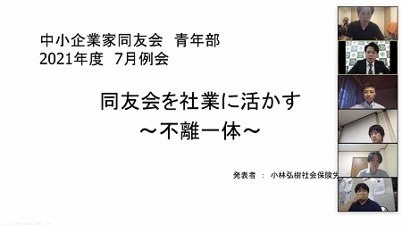 生真面目な性格である小林氏による発表の7月の青年部例会。今年度より第2班の班長になり、かねてより発表したいとの意向を班全員に告げていた中で、満をじしての発表の7月。4月に初めて内容を聞き、発表までの三ヶ月間に、小林氏に様々な事がおこり、自問自答しながら、また、青年部の班で話し合いながら作り上げました。結果、最高の例会になったと思います。