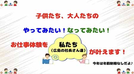 この企画、略して「ドリカム企画」は、第7回から実施しており、広島みなと公園に来場した子ども達から将来の夢などを募集し、後日、会員企業で実現可能な子どもの夢を抽選でかなえるという内容です。これは子どもの頃の職業体験が、将来大きくなった時にその職業を選択肢の一つに含めてもらえるようにとの願いが込められています。長期的な人材育成や確保につながってくれることを信じています。