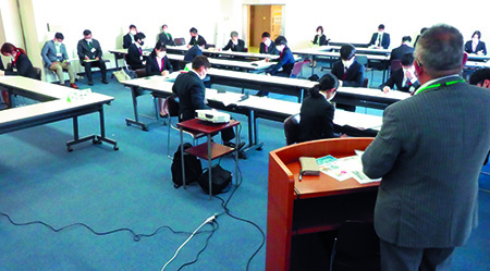 例年であれば1泊2日、終日研修を行っていましたが、2日間の午後のみと研修時間を短縮し、参加者の検温とアルコール消毒の徹底、マスク着用、新入社員同士もソーシャルディスタンスを保つなど、新型コロナウイルス感染防止のための配慮をした上で開催されました。