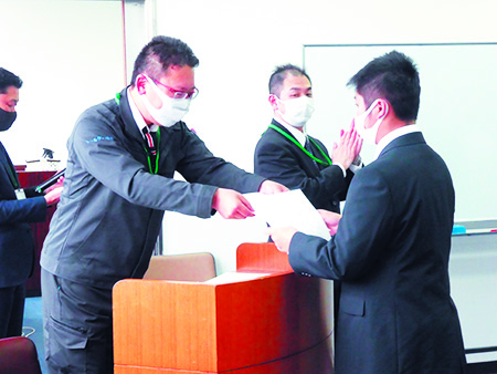 研修の中で行ったカリキュラムは六つ。「他己紹介」を通して仲間同士の交流、「働くとは」というテーマで人は何のために働くのかを考え、「会社の仕組み」を知り、「コミュニケーションゲーム」を通してコミュニケーションの大切さに気づき、社会人の基本である「報連相」を覚え、これからの働いていく自分の「将来設計」をして、研修の最後に全員が3か月後の目標を発表しました。閉講式では藤田実行委員長(㈲シャルダン商会)より修了証書が授与されました。最初は緊張していた新入社員も、最後には連絡先を交換し合うなど同期の仲間もできました。