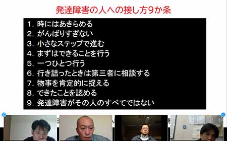 内容としましては「発達障がいとは」「ADHDの特性とは・2次障害・本人たちの思い」「特性がある人への接し方、一緒に考えることの大切さ」という流れと、福山市では「障害」を「障がい」と病名・疾患名以外はひらがな表記する事を教えて貰い、まずはそこからでした。