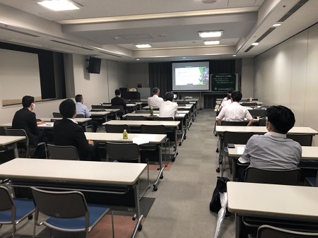 新型コロナウイルスの為 会場人数制限のかかる中Zoom参加併用して7月例会開催しました。報告者の稲田氏はZoom会場から。司会はZoom会場から参加。