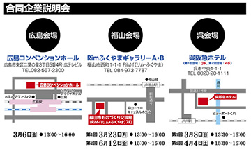 3月から合同企業説明会(以下、合説)がスタート。今年度は広島会場(3月6日)、福山会場(3月23日、6月12日)、呉会場(3月8日、4月4日)の合計5回開催の予定でした。