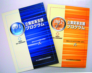 青色の表紙のSTEPⅠ(会社の健康診断用)と黄色の表紙のSTEPⅡ(処方箋用)の2冊のテキストが準備されています。加えて、会活動支援システムe.doyuで定期的に登録すると、自社の変化や全国会員平均などと比較するしくみも準備されています。