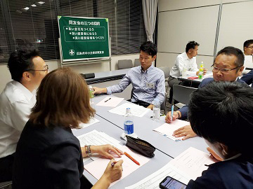 その後グループに分かれ討論し、経営理念や経営指針が「なぜ成文化をする必要があるのか」「作ることがゴールなら必要ないのでは」「どうやったら社員と共有できるのか」など全く異なる考え方がぶつかり、とても白熱したグループ討論を行うことができました。