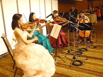 分科会終了後の懇親会は、弦楽四重奏団の生演奏が流れる会場に参加者を迎えて、女全交初となる着席形式で行われました。広島の食材を使い厳選されたコース料理が並び、心に残る最高のおもてなしをと各テーブルでは広島会員がホスト役となり、会話が弾む懇親会となりました。