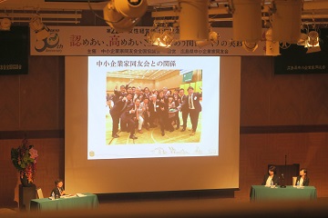 続く記念講演では、同友会理念を礎に、人・企業・地域をつなぎ、未来をつなぐ~地域と共に歩んだ「工房おのみち帆布」20年の物語 と題し、(特非)工房おのみち帆布から木織会長、島田理事、岡田理事の三氏による報告がありました。