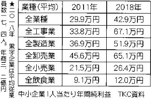 中小企業1人当たり年間純利益(表参照・平均)をみると、全業種で約43万円、製造業約52万円、卸売業65万円と回復をみせています。