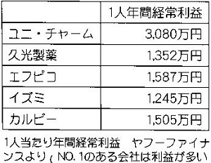 繰り返しになりますが、1位になる「商品・サービス」「地域」「客層」が大切です。そして市場占有率が1位になると従業員1人当たりの経常利益が2倍~4倍になります。 上場企業を見ると、おむつ業界№1のユニ・チャーム、サロンパス貼り薬の久光製薬。福山市のエフピコは営業が強い会社です。また、岡山以西で№1のイズミは利益が高くなっています。
