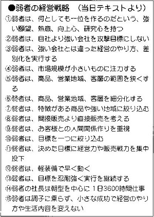 しかし中小企業は、科学的な戦略立案と実行が弱点と感じています。私自身、17年間ランチェスター戦略を勉強し続けています。本日の講義の中で、価値=資金×戦略×戦術×時間という提起がされました。社長が一番勉強して、本業に時間を費やすことが付加価値を高めることに繋がります。共に学び実践しましょう。