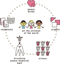 論議の末、日本中の子どもが平和を願って折った折り鶴を再生し、ノートをつくり、世界の子どもたちに無償でプレゼントする。ノートは、原爆のこと、平和の子の像こと、折り鶴と貞子さんのことなどを英文で紹介し、学習できるものにしました。