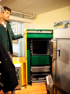たんに薪を燃やし熱に変えるだけでなく、お湯に熱交換するシステムがメーカーの売りとなっているようです。薪、チップ、ペレットそれぞれのボイラーが全て熱交換によるボイラーシステムとなっています。田舎では薪、街中ではペレット、集約施設ではチップとなっているようで、隣国ドイツへの出荷は七割がペレットボイラーです。
