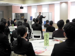 二月二七日、福山大学にて福山・尾道・三原の企業と学生による交流会が開催されました。午前中は模擬面接、午後は県求人社員教育委員長の川中英章氏による講演の後、大学生と経営者によるグループ討論が行われました。