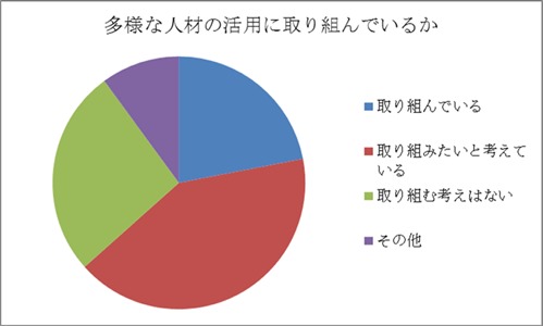 必要な人材の確保については50%、まさに半数が「不足気味」と答えました。続いて、将来的な人材確保の観点から「ダイバーシティ」(女性や障害者・高齢者の活用など、多様な雇用のあり方)への取り組みについて聞いたところ、21%がすでに取り組んでおり、40%が取り組みたいと考えていると答えました。