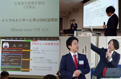 今回の例会は近年多くの企業が集客や求人に活用しているSNSにフォーカスを当てたもので、東支部青年部の竹常さんを講師、上原さんをコーディネーターとして登壇いただき、活用術を報告いただきました。