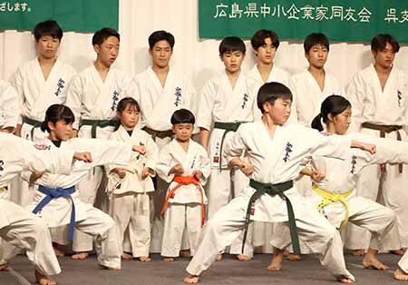 乾杯に先立ち、新極真会 大濱道場の皆さんによる力強く、気迫のこもった演武が披露されました。会場内のボルテージも上がってきます。