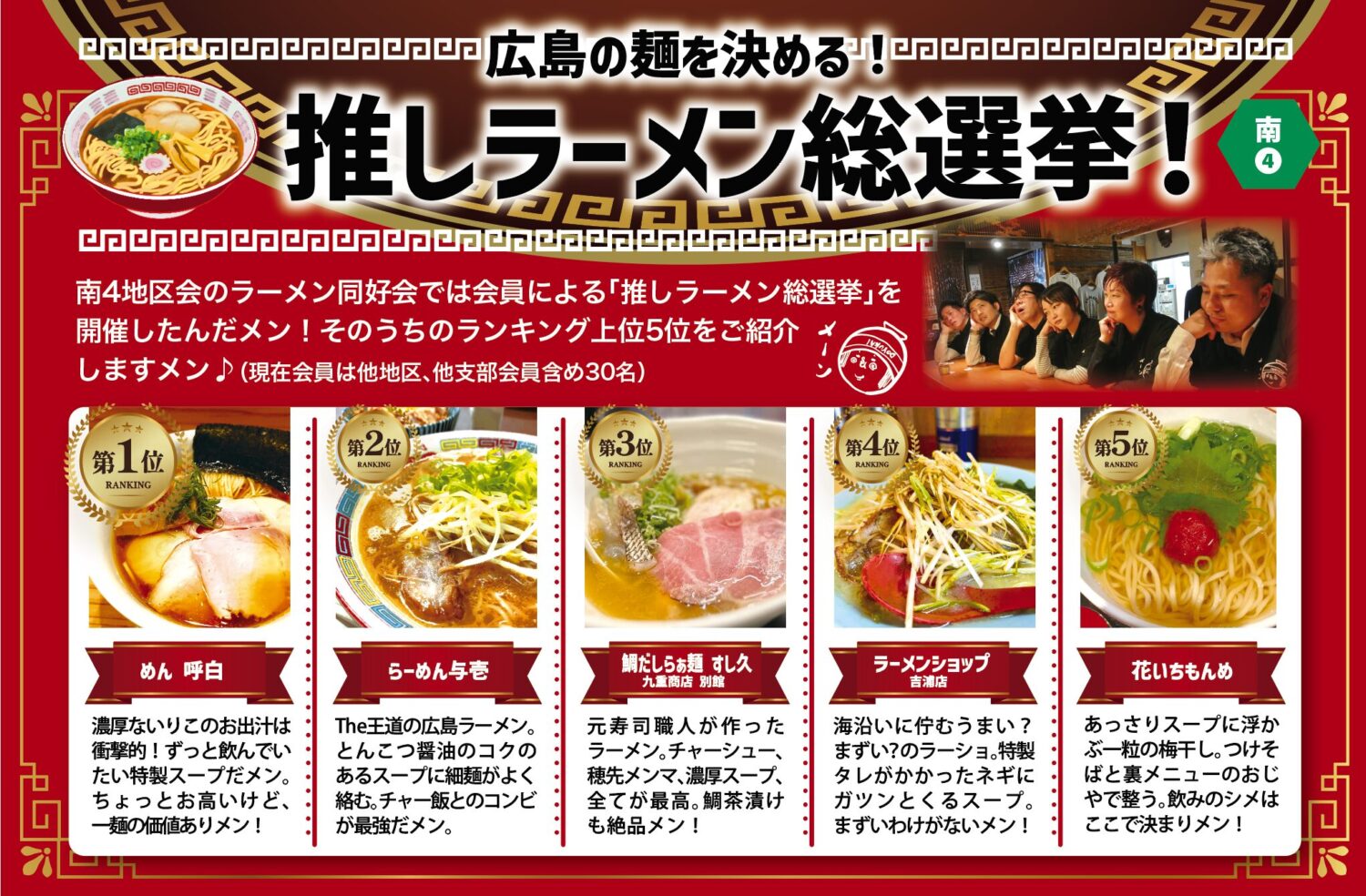 そんなラーメン同好会ですが、今回の記事(エリア報ひろしまねっと7月号)では、ラーメンをこよなく愛するメンバーにおすすめするラーメン店を個々のランク付けしていただきました。