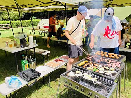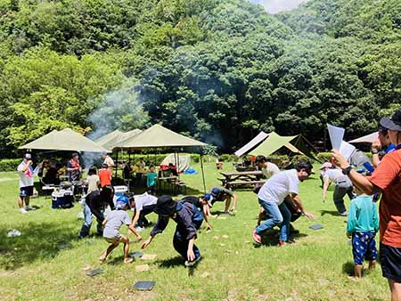テントなどは業者さんで準備。早速バーベキューが始まります。食材は豊富にあり、各々好きな席で食事や会話を楽しみました。子どもたちは早々に食べ終わると近くの川に遊びに行きます。しばらくすると、大人と子どもが混じってのゲーム大会。表裏が白黒の札をそれぞれのチームでひっくり返すゲーム。良い運動になりました。こうして、楽しい時間が過ぎていきました。