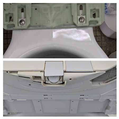 温水洗浄便座の場合は大抵右側側面にボタンが付いていますので、押しながら手前に引っ張れば外れます(タンク一体型だと浮くだけのものもあります)。そこが一番汚れているので、鳥肌が立って嘔吐するかも知れません。便座を立てて磨いて脱臭フィルターが付いていれば洗いましょう。