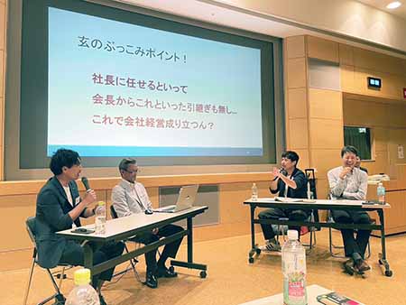 今回の例会は同友会会員であるエイフク(株)の益田会長・社長の間で行った事業承継について、どのような事業承継を行ったのか、また、そのやり方は良かったのか悪かったのかという解説を河口氏のコーディネートのもと、パネルディスカッション形式で事業承継専門税理士の末永税理士に解説してもらうという少し変わった例会報告となりました。
