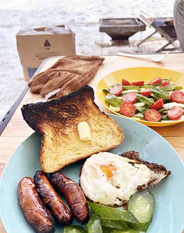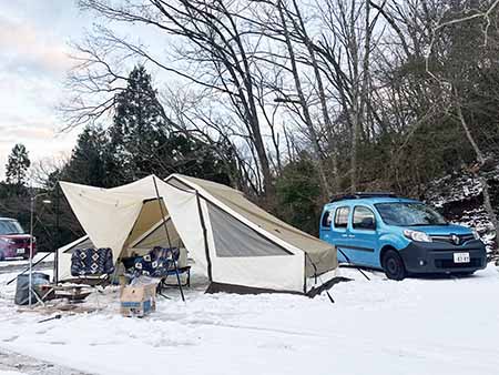 そんな私ですが、昨年の11月、とある出来事が転機となり、キャンプに目覚めました。それは「明日雪が降りそうだから撮影してほしい」という急な依頼。朝一番の美しい雪景色を撮影するため、現場に泊まる必要がありました。その日はオートキャンプ場付きの施設だったので、私は車中泊、社員はテント泊という形で宿泊。夜は地元の道の駅で調達した食材でBBQを楽しみ、電気毛布に包まれて眠りにつきました。