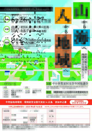 来る6月26日(木)~27日(金)、広島で第9回環境経営・地球環境交流会を開催します。この行事は、10年ぶりの開催。中同協委員会の、復活開催への強い思いに広島同友会環境経営委員会が応え、企画・設営を担当しています。テーマは「山から海へ、人から地域へ~持続可能な地域社会を実現しよう~」です。