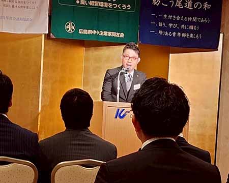 4月12 日(土)尾道国際ホテルにて尾道支部 青年部会 第24 回定時総会が執り行われました。会の中では清水部会長が前期の振り返りを行い、「新しい取り組みばかりで、負担をかけてしまったことと思いますが、常に協力体制を築いて頂き、ありがとうございました。本当に感謝の気持ちでいっぱいです。」と周りへの強い感謝を述べられました。