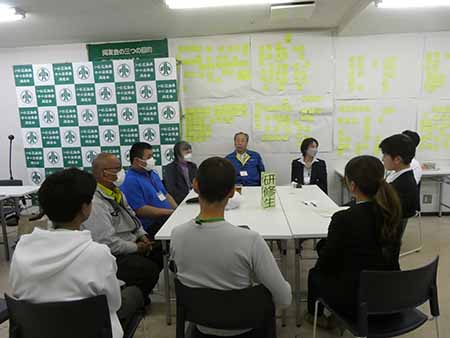 今年、先輩社員として登場したのは、建内レンタルのTさん。県立福山北特別支援学校を卒業し、会社の第一線で活躍中です。学校の大先輩でもあるTさんは、仕事中や趣味のマラソンの写真を紹介しながら発表する様子に、研修生だけではなく経営者も聞き入っていました。建設業の建内レンタルの仕事は体調管理も大切な仕事の一つ。体調管理の質問には、「しんどい時はちゃんと自分から周りの社員さんに言う」と答え、「会社に行きたくないと思ったことは今まで一度もないです」というお話には、スタッフは「すごい」と感心しきりでした。
