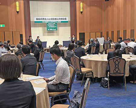 今回の「学校の先生方と経営者との懇談会」では、最初に5月17日に開催された「高校生と保護者のための企業ガイダンス」の振り返りを行いました。