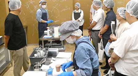 まず1社目のトーホー(株)(安佐北区)は、ガラスビーズを製造し、世界に出荷している歴史の長い製造業です。暑い工場内での作業は体力を要します。また、良いものをつくるために手を抜かず確実な仕事をすること、スピードよりもクオリティを重視されていました。工場内に掲示してあった「一粒入魂」が印象的でした。