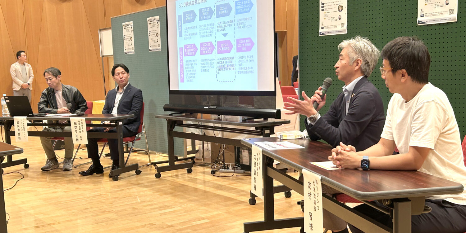 続く第2部のクロストークでは、友村氏に加え、同友会広島西支部長でシンワ(株) 代表取締役の太原真弘氏、呉信用金庫地域貢献部長の服部亨祐氏が登壇。