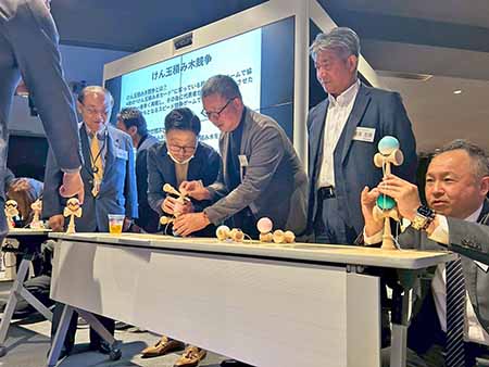 当日のだしもの一つ目は、イワタ木工さんによる「けん玉積み木大会」。参加者は8グループに分かれトーナメント形式で挑みました。動かないけん玉なのに、これが結構難しい…!積んでは崩れ、また積んでは崩れを繰り返しながら、チームで声を掛け合い、一丸となってトライ。会場は大いに盛り上がり、自然と拍手と笑顔が広がりました。