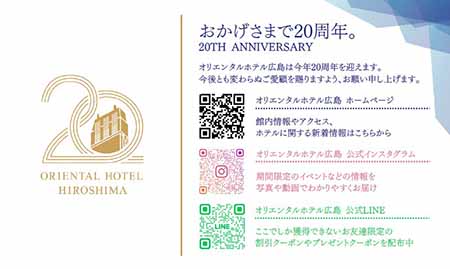 また、オリエンタルホテル広島は2026年10月に開業20周年という大きな節目を迎えます。平和通りのランドマークとして、これまで数多くのビジネスの集いや地域交流を支えてきた歴史を胸に、次の20年も地域の皆様に必要とされ、愛され続けるホテルでありたいと考えております。ご宿泊・宴会・レストランのご利用はもちろん、経営上の様々なお集まりの際にもお声をかけていただけますと幸いです。