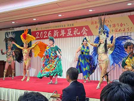 中盤では、サンバチーム「ボーザ・ジ・ヒロシマ」によるパフォーマンスが披露されました。サンバはブラジルの伝統文化であり、元気、活気、そして躍動の象徴。その情熱的なリズムとエネルギッシュな踊りは、会場の空気を一変させ、新年にふさわしい前向きなエネルギーと笑顔を参加者全員に届けました。躍動する音楽と身体表現は、呉支部が目指す「挑戦し続ける経営者の姿」とも重なり、大きな拍手が鳴りやみませんでした。