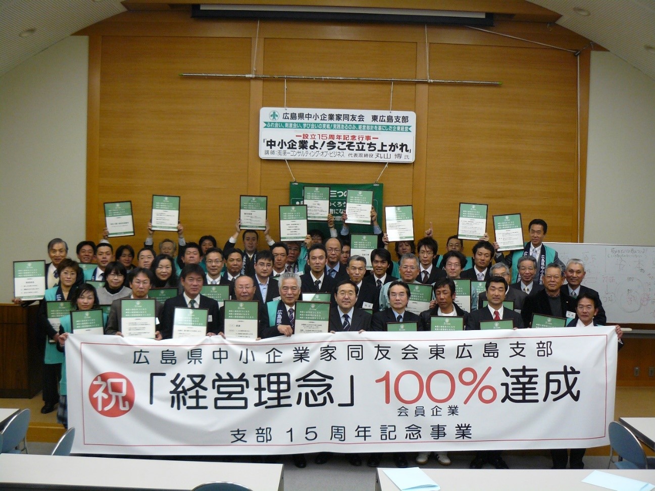 支部発足から15年目、発足当時から三宅支部長を副支部長として支えてこられた中国ビー・エフ(株)の原田社長が支部長になられます。15年の記念行事は支部理事の中から「経営理念のない会社は会社でない」という声がでて、会員全員の経営理念を作ってもらおうということになりました。理念作成勉強会などを何度も開催、参加されない会員には会社訪問を行い、会員全員が経営理念を作成しました。この活動はとても評価され、中小企業家しんぶんに「経営理念100%達成」として取り上げられました。作成した経営理念は素敵な額に入れ、会員に15周年の記念品として配布しました。今でも当時の会員企業のところに行くと壁に掛けられています。原田支部長が2期支部長を努めた後、(株)昭和観光社の平森社長が2期4年支部長をにないます。自社の事業転換で多忙な時期でしたが、だからこそ支部長をしたいとの意気込みの4年間でした。その後、氏は高齢化社会のユニバーサルツーリズムの促進事業で第22回ツアーグランプリ2015国土交通大臣賞など数々の賞を受賞しました。また、この時期(2013)事務局から、地区会を発足してはどうかということで、地区会発足の準備が始まりました。翌年3地区会が発足しました。その後、(株)堀内造園の堀内社長が青年部会を発足。東広島支部の体制がかなり変化した時期でもありました。これまで会に参加していなかった会員の方々の参加が少しずつ増えてきました