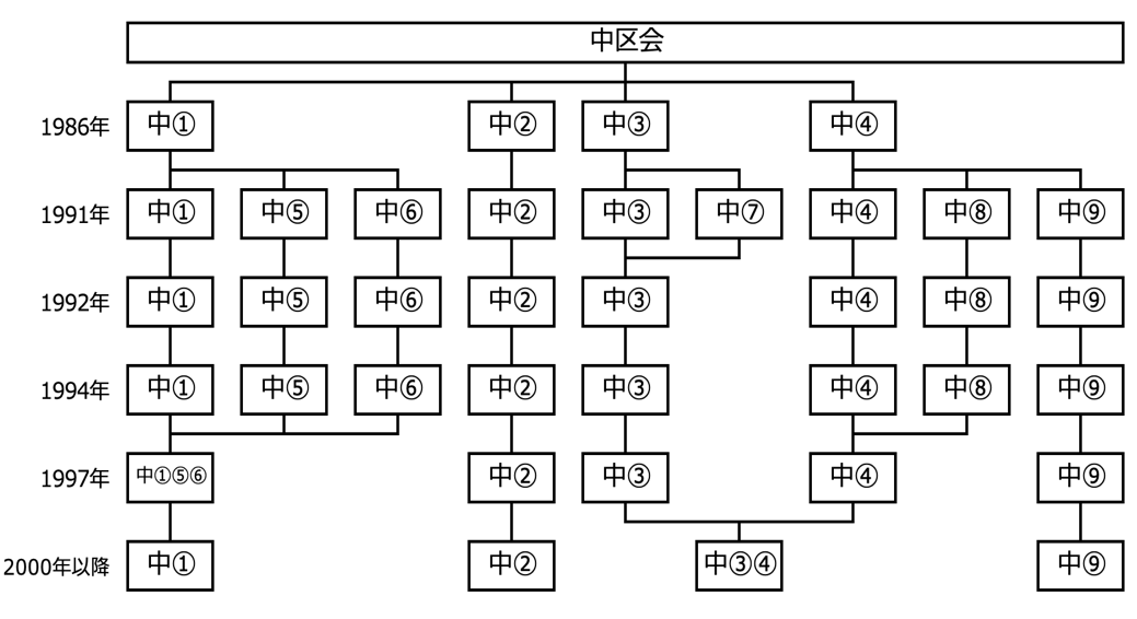 2023年現在、広島中支部は中①地区会、中②地区会、中③④地区会、そして中⑨地区会という4つの地区会で構成されています。広島中支部には過去最大で9地区会存在していたという、そんな地区会の歴史を今回は紐解いてみようと思います。