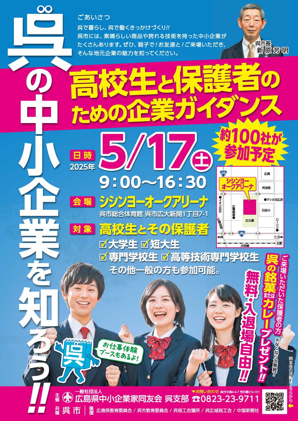 近年では新卒採用の為、保護者に地元の中小企業をもっと知ってもらう活動として、2017年に地域内連携推進委員会よる「ビジネスマッチングフェア」を開催。これがきっかけとなり、2018年からは呉支部主催、呉市共催で「高校生と保護者のための企業ガイダンス」を開催し、出展企業100社以上、来場者数は500名を超えるなど、学校関係からも授業の一環として参加する行事となり、継続的に開催しています。